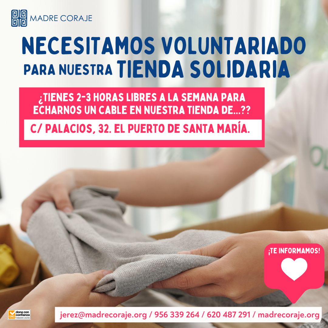 La Fundación Madre Coraje lanza un llamamiento a la ciudadanía de El Puerto de Santa María para sumar manos y corazones a su tienda solidaria de la calle Palacios, 32, un espacio donde cada prenda, libro o accesorio tiene una segunda vida… y un impacto positivo en el mundo.