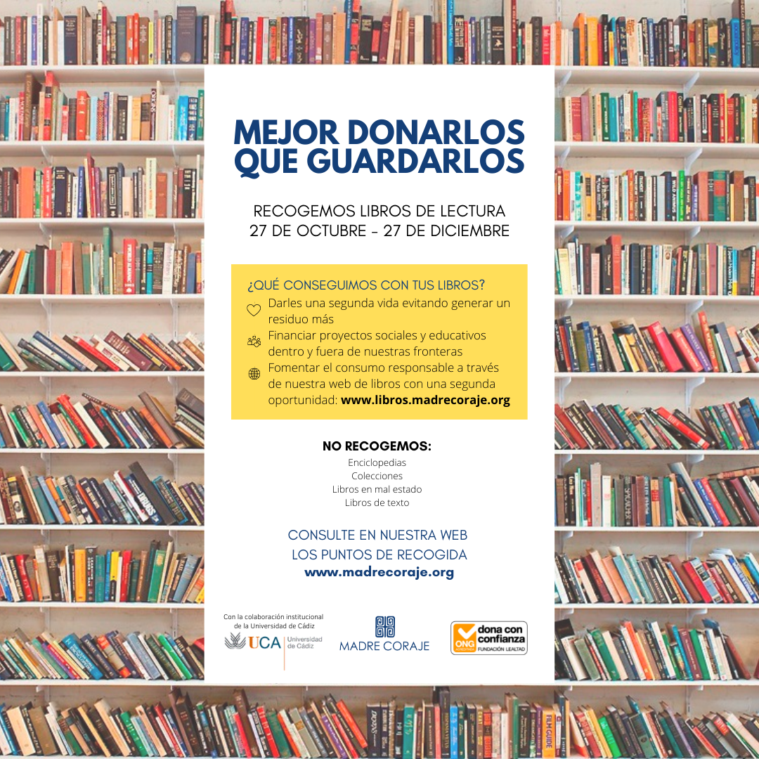 ‘Mejor donarlos que guardarlos’. Las personas interesadas en entregar en Jerez de la Frontera o El Puerto de Santa María libros de lectura (evitando libros de texto, enciclopedias, libros en mal estado…) a Madre Coraje pueden hacerlo: