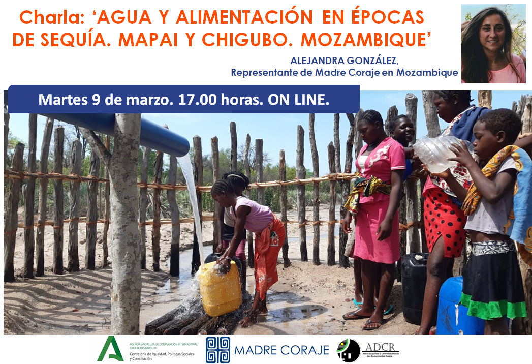 ¡Voluntariado, amistades y gente próxima a Madre Coraje! ¡El 9 de marzo, Alejandra González, nuestra Representante en Mozambique, nos habló sobre la situación en el país africano y sobre el proyecto, financiado por la Agencia Andaluza de Cooperación Internacional, Agua y alimentación en épocas de sequía. Mapai y Chigubo. ¡Podéis acceder a la charla a través de este enlace: https://youtu.be/Itl_t-N0TUA.