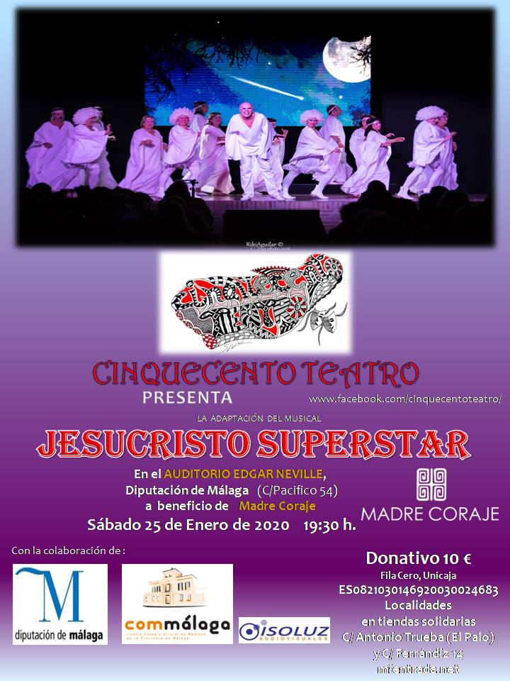 El Auditorio Edgar Neville de la Diputación de Málaga acogerá el próximo 25 de enero, a las 19.30 horas, a beneficio de la Asociación Madre Coraje, la adaptación musical de Jesucristo Superstar de la mano de Cinquecento Teatro.