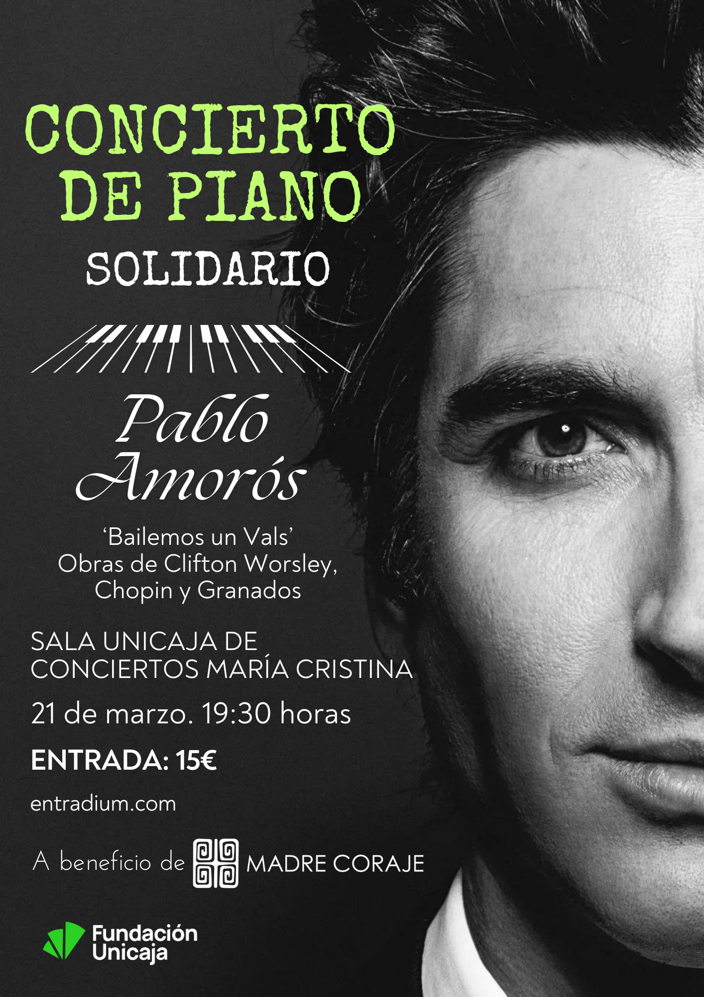 La Sala Unicaja María Cristina de Málaga albergó el 21 de marzo el Concierto de Piano Solidario ‘Bailemos un Vals’ que Pablo Amorós ofreció a beneficio de Madre Coraje. El pianista deleitó al público asistente con obras de Clifton Worsley, Chopin y Granados.