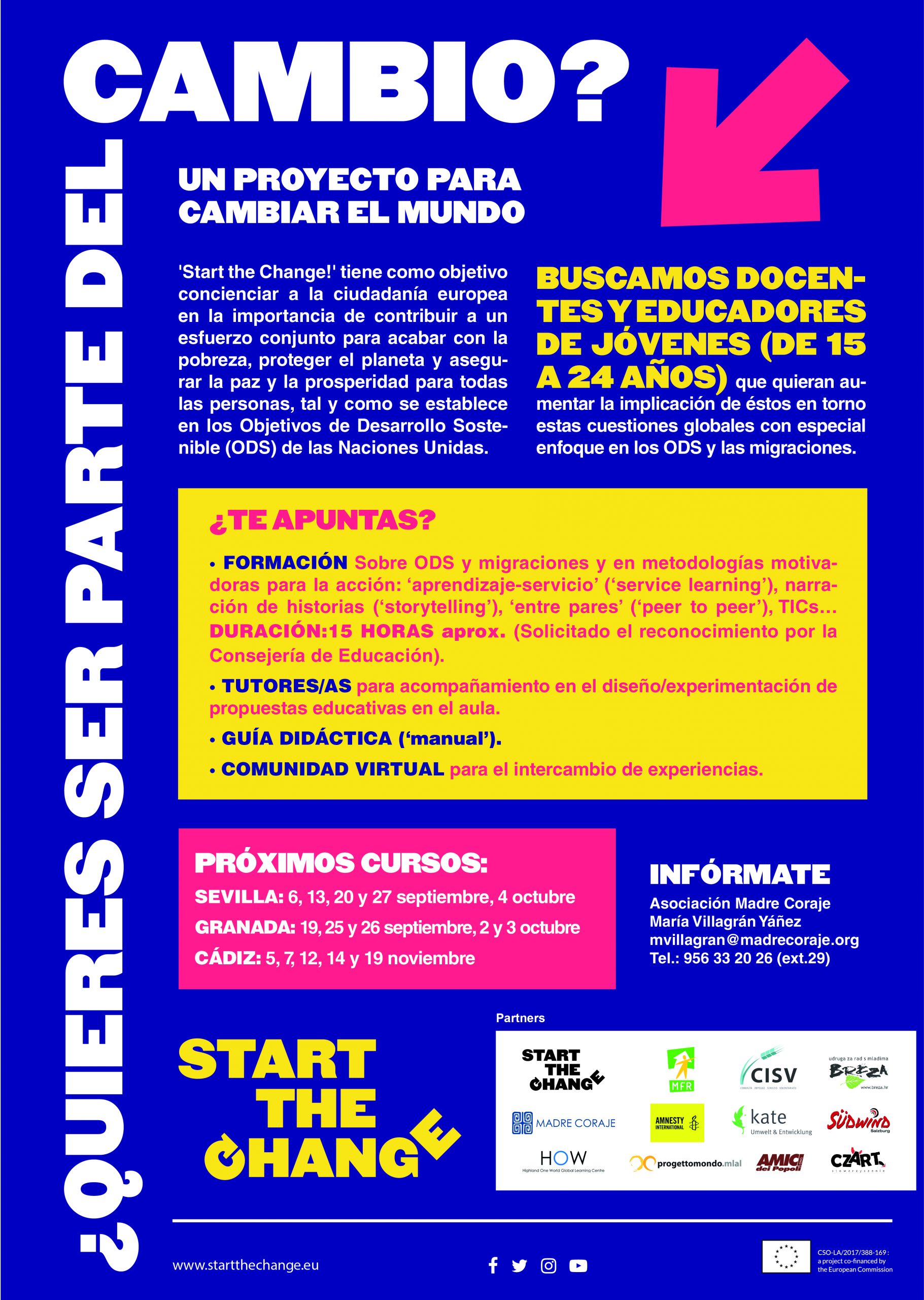 ¿Eres docente o educador/a de jóvenes? ¿Te gustaría ser capaz de motivarles y empoderarles como ciudadan@s globales? El proyecto ‘Start the change’ puede ayudarte. Hemos diseñado una formación para proporcionarte herramientas y metodologías innovadoras (ApS, ‘storytelling’, P2P…) orientadas aumentar los conocimientos y habilidades de l@s jóvenes en relación a los ‘Objetivos de Desarrollo Sostenible’ (ODS) y las migraciones así como para animarles a la acción.