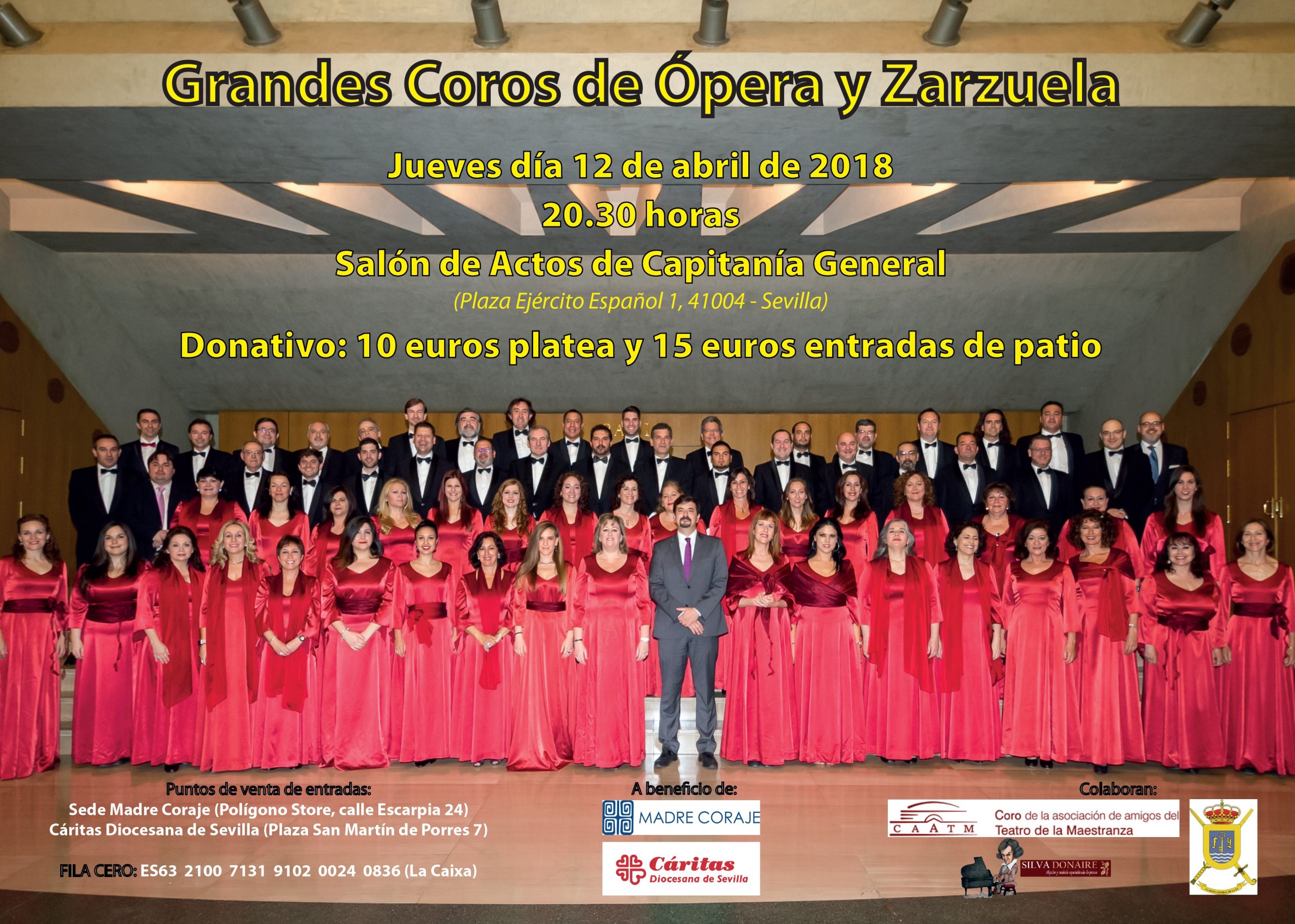 El próximo 12 de abril, a las 20.30 horas, el salón de actos de Capitanía General (Plz. Ejército Español 1) de Sevilla, acogerá un concierto de Grandes Coros de Ópera y Zarzuela a beneficio de Madre Coraje y Cáritas. La aportación de los asistentes, 10 euros (platea) ó 15 euros (patio), ayudarán a financiar, entre otras, las acciones sociales de Madre Coraje: iniciativas en España para apoyar a la población afectada por la crisis, Educación para el Desarrollo en España, respeto medioambiental y labor humanitaria y de cooperación en Perú y Mozambique.