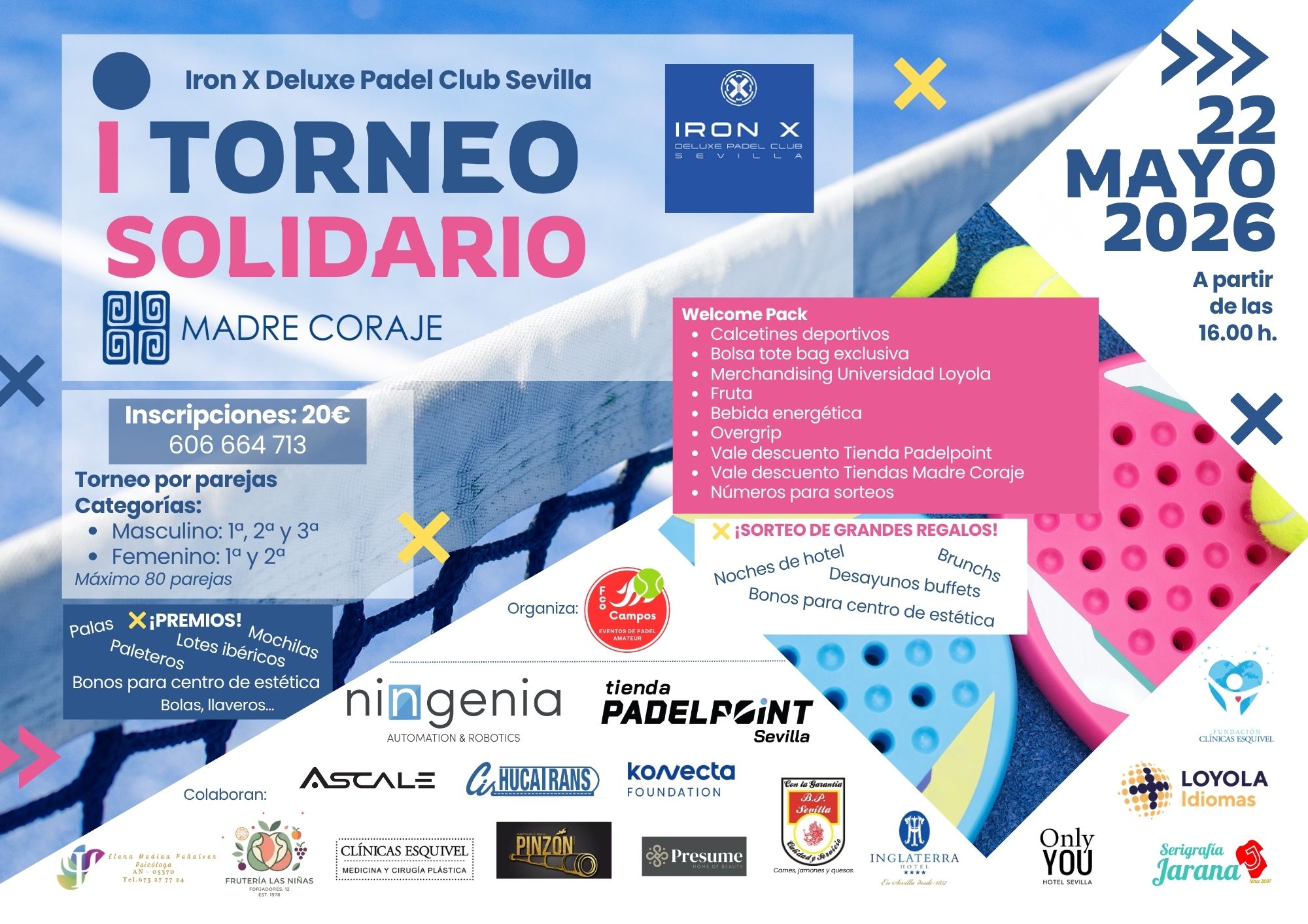 El Iron X Deluxe Padel Club Sevilla será el escenario, el próximo 22 de mayo a partir de las 16.00 horas, del I Torneo Solidario Madre Coraje, una cita deportiva y solidaria que reunirá a personas aficionadas al pádel con el objetivo de apoyar proyectos sociales. Las personas interesadas en participar pueden inscribirse por parejas (máximo 80 parejas) en categorías masculina (1ª, 2ª y 3ª) y femenina (1ª y 2ª), por 20 euros, a través del teléfono 606 664 713.