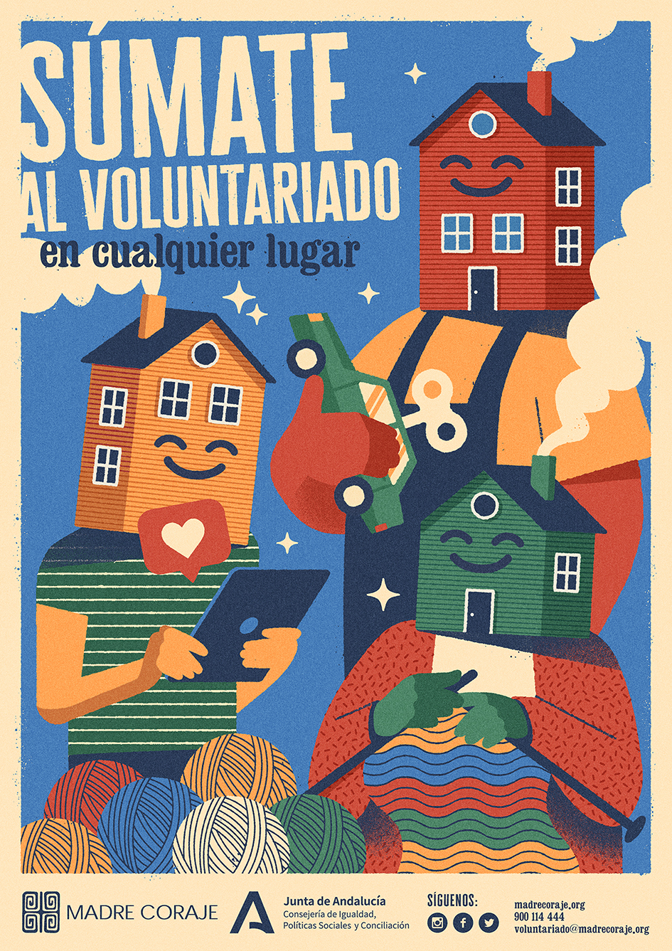 “Esta campaña es muy diferente a la que hemos puesto en marcha hasta el momento en Madre Coraje. El hecho de estar buscando un voluntariado diferente al habitual, nos hizo buscar ideas distintas. Por eso los protagonistas de la campaña son tres personas haciendo actividades de voluntariado no presencial y sus cabezas vienen representadas por casitas sonrientes”, añade Isabel Palma, Responsable de Voluntariado de Madre Coraje.