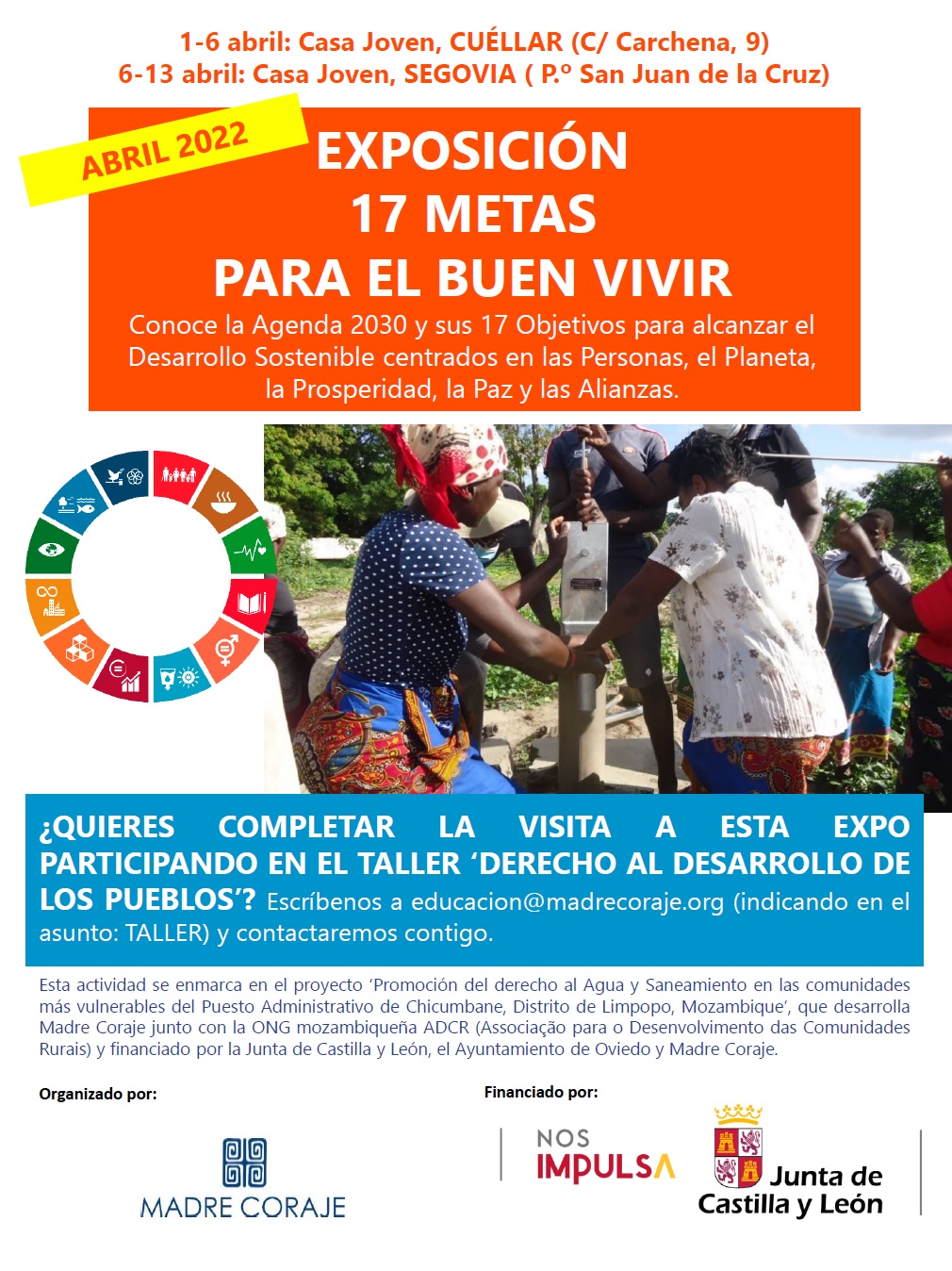 Madre Coraje acerca los Objetivos de Desarrollo Sostenible a la ciudadanía de Cuéllar, desde el viernes 1 hasta el 6 de abril, y a la de Segovia, del 6 al 13, a través de la exposición ’17 metas para el Buen Vivir’, actividad de sensibilización enmarcada en el proyecto ‘Promoción del derecho al Agua y Saneamiento’ que Madre Coraje tiene en marcha en Mozambique con la financiación principal de la Junta de Castilla y León.