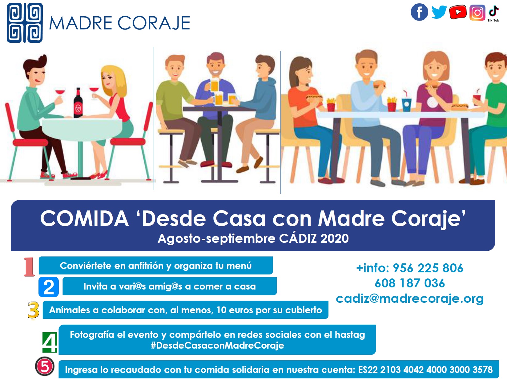 En Cádiz, hemos lanzado una original iniciativa con el fin de animar a compartir con amistades una comida solidaria ‘desde casa’. ‘Desde Casa con Madre Coraje’ pretende así dar continuidad, adaptándonos a las circunstancias por el Covid-19, a la cita solidaria que cada verano Madre Coraje organiza en la capital gaditana reuniendo a más de 180 personas. “Nuestra propuesta, este año, es que las más de 20 mesas que nos reuníamos en un espacio común cada año, se reúnan este año, por separado, en un sinfín de casas gaditanas”, ha explicado Mercedes Ravina, delegada de Madre Coraje Cádiz.
