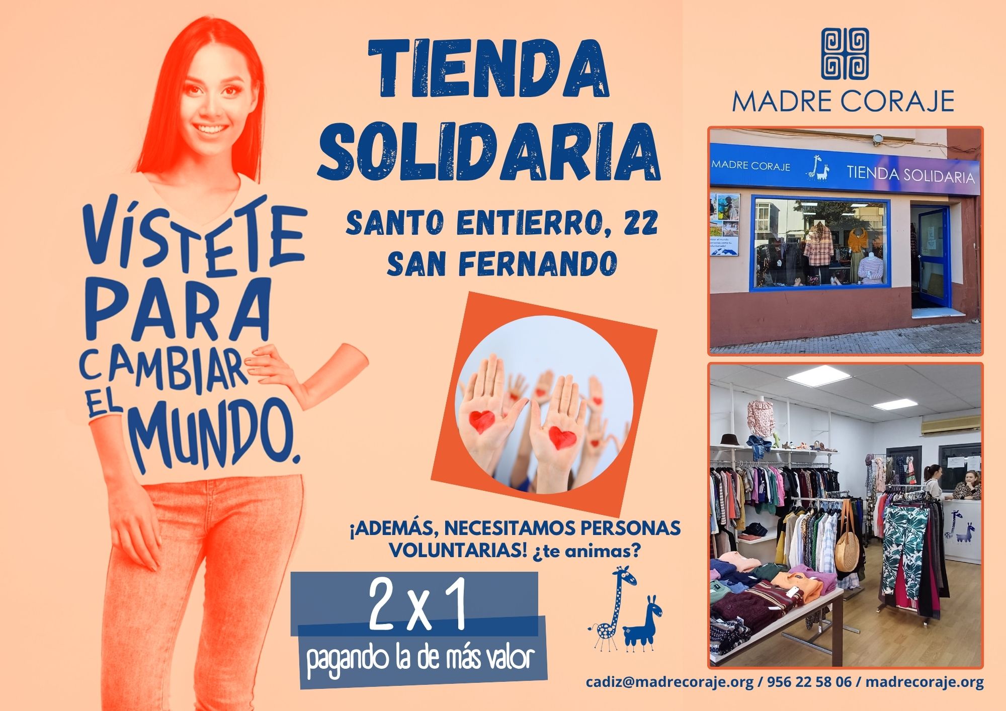 La tienda solidaria de la Fundación Madre Coraje en San Fernando, situada en la calle Santo Entierro, 22, lanza una promoción muy especial: hasta el 31 de octubre, por la compra de dos prendas, solo se paga la de mayor valor. Una oportunidad perfecta para renovar el armario de forma responsable, apoyar una causa solidaria y cuidar el planeta al mismo tiempo.