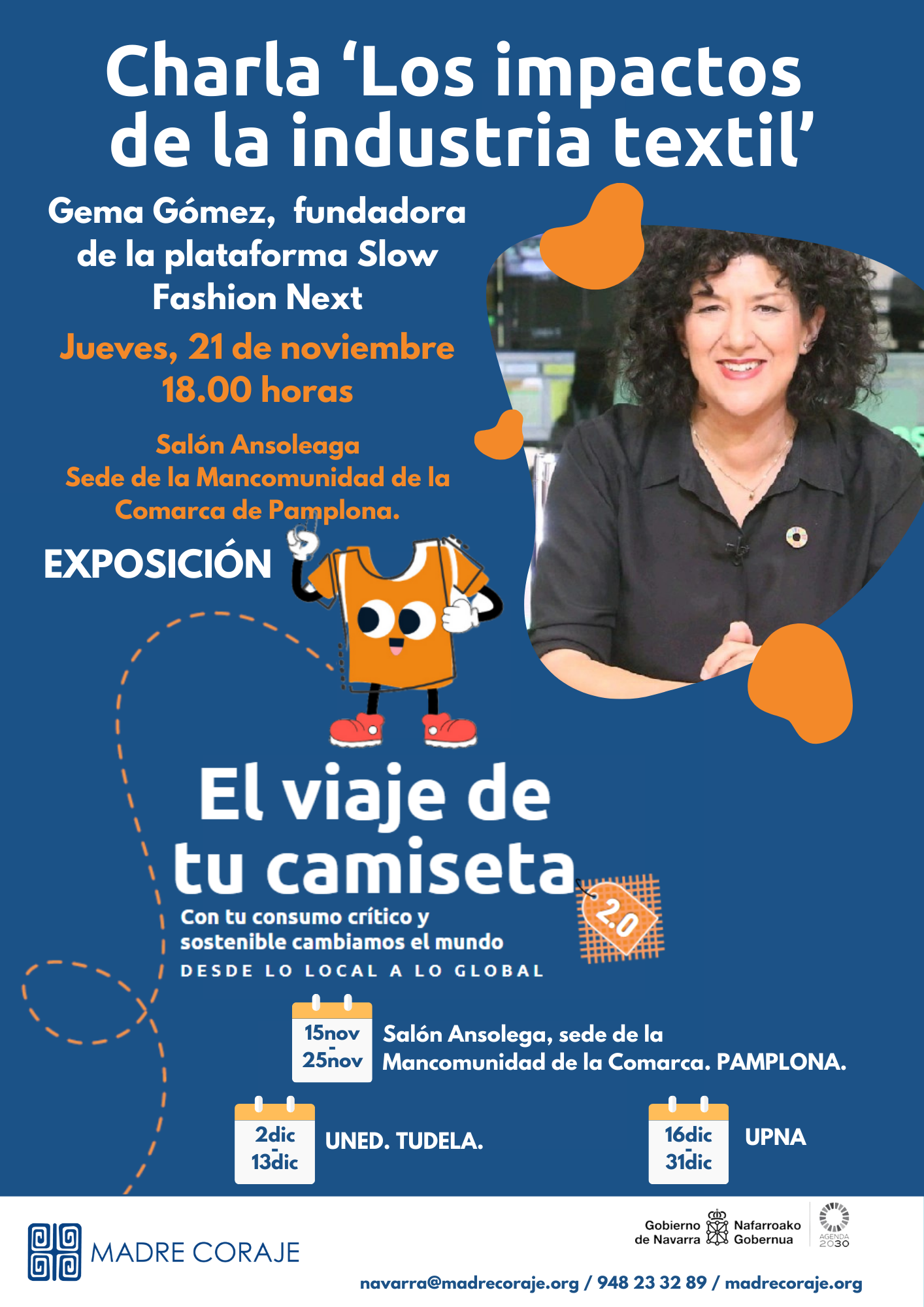 Dentro de las actividades organizadas en torno a la exposición de la Fundación Madre Coraje ‘El viaje de tu camiseta 2.0’, cuyo objetivo es concienciar sobre el impacto económico, ambiental y social que tiene la moda rápida o fast fashion, el Salón Ansolega de la Mancomunidad Comarca Pamplona acogió el 21 de noviembre la charla “Los impactos de la industria textil”, cuya ponente fue Gema Gómez, experta en moda slow y fundadora de la plataforma Slow Fashion Next. Gema Gómez ha sido coordinadora del movimiento Fashion Revolution Spain y es organizadora de las Jornadas Anuales de Moda Sostenible. Actualmente lidera Slow Fashion Next, una plataforma cuyo objetivo es crear una industrial textil sostenible y alternativa a la industrial convencional actual o “fast fashion”.