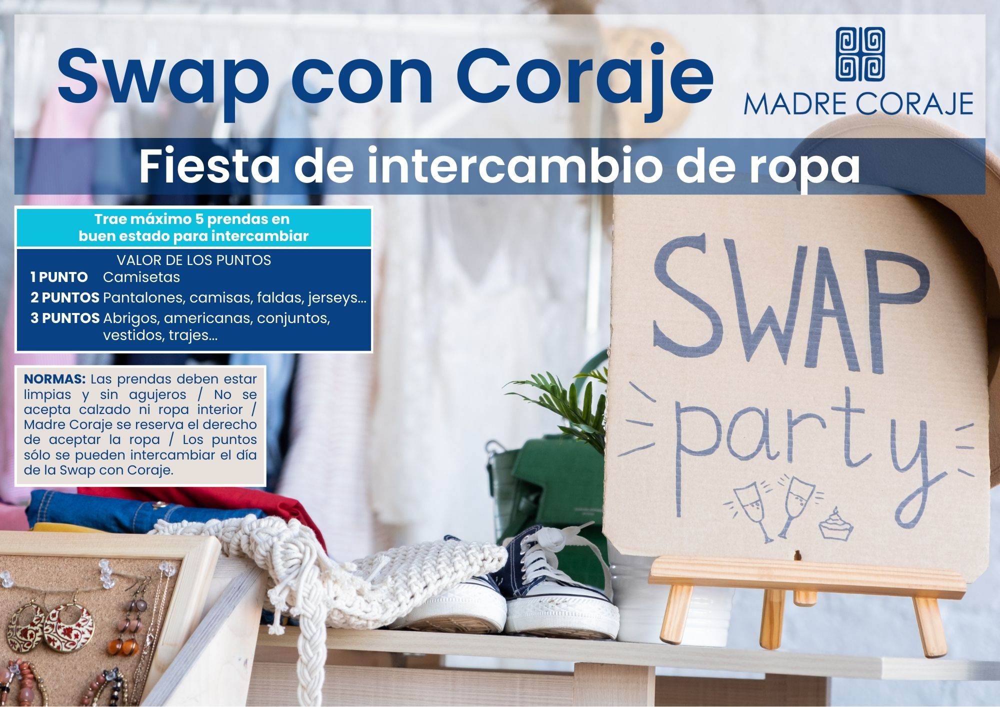 La Fundación Madre Coraje invita a la ciudadanía a vivir una experiencia diferente y consciente con ‘Swap con Coraje’, una fiesta de intercambio de ropa que tendrá lugar la semana que viene en muchas de sus tiendas solidarias*.